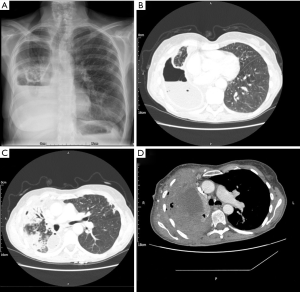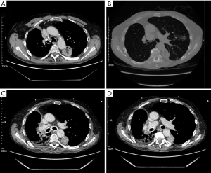 Buttressing of the stump with a tension-free vascularized pedicled flap (46,62) should be considered. This aims to increase the blood supply to the stump and has been described using intercostal (63), latissimus dorsi (64,65) or serratus anterior muscle flaps (66,67), pectoralis major and diaphragm flaps (46,68), omentopexy (69,70) thymic flap (71), pericardial fat pad (72) and pleural flap (73). Figure 2 shows CT images of a patient who developed BPF following bilobectomy. Re-operation, primary closure, buttressing with intercostal muscle, obliteration of the pleural space using pedicled serratus anterior and pectoralis muscle flap was performed. Where the above techniques fail, open window thoracostomy can be considered for management of sepsis if mediastinum is fixed. Thoracoplasty may be considered for recurrent cases. Operative mortality is 3.8% to 5.1% (57,74) with surgical cure rates between 88–90% (57,75).
