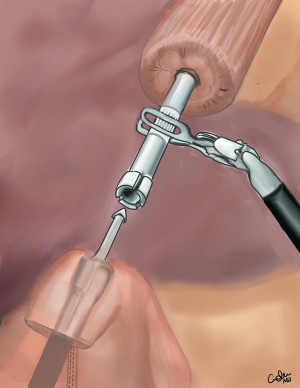 Next the posterior port site is extended and a small wound protractor is placed. The specimen is removed and sent for frozen section. The tip of gastric conduit is opened and the contents are sucked out. The handle of the 25 mm EEA stapler is passed though the intercostal space and introduced into the gastric conduit through the opening. The handle is introduced deep into the conduit while pushing against the greater curvature to the desired point where the anastomosis is going to be fashioned. At this point the pin of the EEA stapler is brought out along the greater curvature and engaged with the anvil. The stapler is closed and the anastomosis is fashioned (Figure 3). The donuts are checked for completeness and submitted as final proximal margin. A nasogastric tube is placed. The redundant gastric conduit is cut using blue loads 2 cm away from the anastomosis. The fat pad is put between the anastomosis and the trachea. A stitch is placed to narrow the hiatus to prevent future para conduit hernias. The pleural space is irrigated with antibiotic solution. The intercostal are injected with local anesthetic. A Jackson-Pratt (JP) drain is placed between the esophagus and the spine. A chest tube is placed.