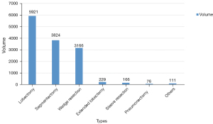 During the last year, 12,456 patients received VATS pulmonary resections (92.3%), 398 patients received RATS resections (2.9%), and 639 patients received open thoracotomy (4.8%) (Figure 5). In total, 11,938 (88.5%) patients were confirmed as having malignant diseases and 1,555 (11.5%) patients had benign diseases. Both the rate of malignancy and the percentage of MIS were similar to the previous year, not influenced by the outbreak of COVID-19. Lobectomy was still the most common surgical procedure (n=5,921, 43.9%), followed by segmentectomy (n=3,824, 28.3%), wedge resection (n=3,166, 23.5%), extended lobectomy (n=229, 1.7%), sleeve lobectomy (n=166, 1.2%), pneumonectomy (n=76, 0.6%), and others (n=111, 0.8%) (Figure 6).