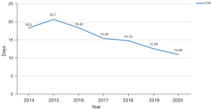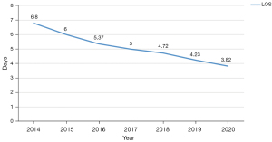 As an index for postoperative outcomes after pulmonary surgeries, the average LOS after surgery was further shortened to 3.82 days, which has continuously decreased over the past years (Figure 8). On the one hand, this was the result of the development of enhanced recovery after surgery (ERAS) program in recent years. On the other hand, it reflected a low rate of postoperative complications owing to improving surgical techniques and perioperative care.