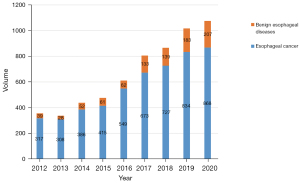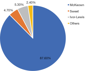 In 2020, the total number of esophageal procedures exceeded 1,000 cases, reaching a historical high of 1,075 cases. A total of 868 esophageal cancer patients and 207 patients with benign esophageal diseases received surgical treatment at the Shanghai Chest Hospital, regardless of the impact of the COVID-19 pandemic (Figure 9). Among the total of 790 patients who received esophagectomies, minimally invasive esophagectomies (MIE) accounted for 87.1% cases, including 518 video-assisted esophagectomies (65.6%) and 170 robotic-assisted esophagectomies (21.5%), both of which increased comparing with the year before (Figure 10). The three-hole McKeown procedure was still the most preferred approach, applied in 692 patients (87.6%), followed by the Ivor-Lewis procedure in 42 patients (5.3%) and the left-thoracic Sweet procedure in 37 patients (4.7%) (Figure 11). Furthermore, 78 patients with early-stage esophageal cancer received endoscopic submucosal dissection (ESD) in 2020 (Figure 12).