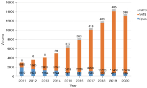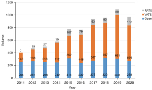 Minimally invasive thoracic surgery represents the advance of modern thoracic surgery and now plays a central role in our services, with over 90% of all thoracic procedures being completed by MIS approaches, which was even higher than in 2019. There was a tripling of minimally invasive segmentectomies, mainly because of the increased early detection of pulmonary lesions due to the screening for COVID-19 during the pandemic in 2020. Compared to standard lobectomy, anatomical segmentectomy demonstrated similar oncological results along with better pulmonary function preservation for those patients with peripheral small-size lung cancers according to the Japan Clinical Oncology Group 0802 (JCOG 0802) trial (4). However, both the JCOG 0802 and Cancer and Leukemia Group B 140503 (CALGB 140503) trials have limitations in their study design. Further evidence is needed to answer the question as to whether minimally invasive segmentectomy is superior to traditional lobectomy in terms of perioperative outcomes for patients with peripheral small-size early-stage lung cancers. Therefore, a multi-institutional, prospective, open-label, randomized phase III trial comparing VATS segmentectomy versus lobectomy for GGO-containing early-stage invasive lung adenocarcinoma is ongoing at the Shanghai Chest Hospital. We truly hope that this clinical trial can prove the superiority of minimally invasive segmentectomy so that more patients can benefit from the advent of modern surgical skills and technology.