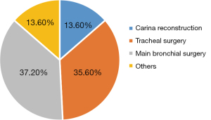 The division of tracheal surgery successfully completed 66 tracheal and bronchial procedures in 2020, including complicated resections and reconstructions, representing an 11.9% increase compared to 2019 (Figure 15). Among them, there were 23 (35.6%) tracheal surgeries, 25 (37.2%) main bronchial resections, and 9 cases (13.6%) of carinal resection and reconstruction (Figure 16). The average LOS was 10.8 days, with an in-hospital mortality rate of 3.0%.