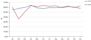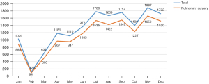In 2020, a total of 13,493 patients with pulmonary diseases received thoracic surgery at the Shanghai Chest Hospital. There was only a 7.5% decrease compared with the year before, despite of the significant impact of the COVID-19 pandemic (Figure 3). Because of the COVID-19 outbreak, there was a temporary decrease in pulmonary surgeries at the Shanghai Chest Hospital around February. The number of both local and non-local patients seeking medical care at the Shanghai Chest Hospital declined sharply because of travel restrictions and local personal quarantine (3). Fortunately, routine thoracic surgery services gradually resumed and then increased steadily when the situation of COVID-19 was effectively controlled in China after April 2020 (Figure 4).