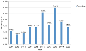 Categorical and continuous variables were presented as frequencies (percentages) and mean ± standard deviation (SD), respectively. Bar, line, and pie graphs were plotted, and the statistical analysis was performed using SPSS version 22.0 (IBM Corp., Armonk, NY, USA).